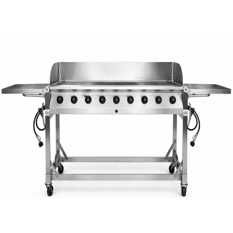 Barbeque a gas a 8 fuochi, completamente in acciaio, pieghevole, dotato di ruote.