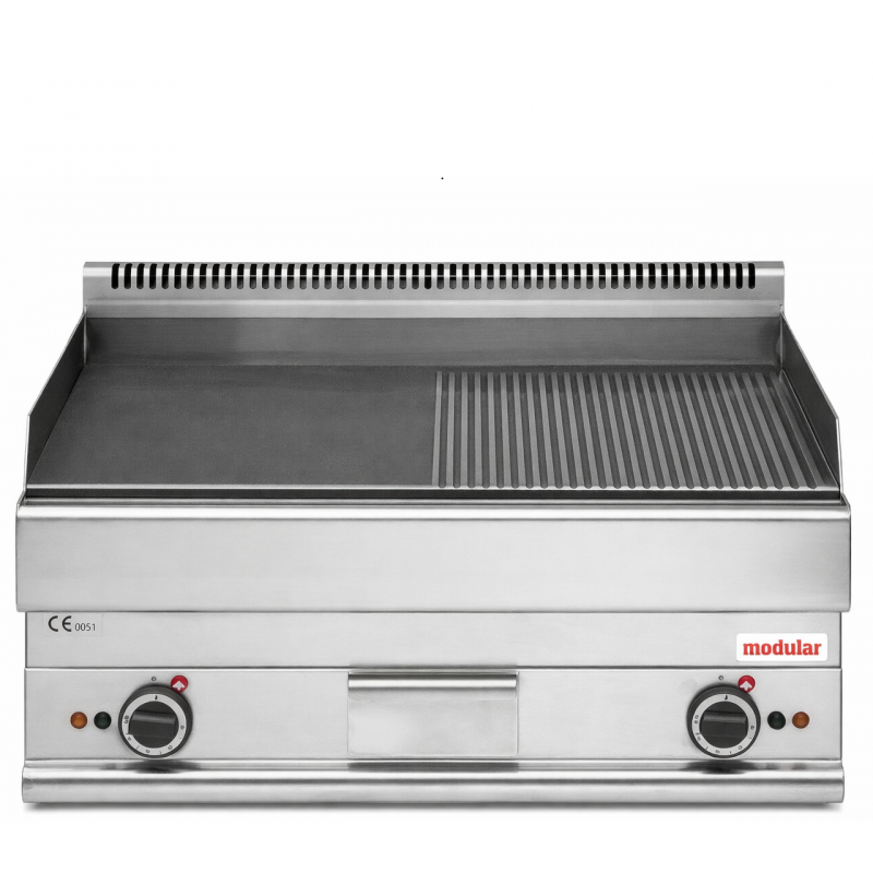 Struttura e piastra in acciaio inox. Piastra mista (liscia e rigata) a comandi indipendenti per la massima flessibilità. Vassoio raccogli grasso. Piedini antiscivolo.